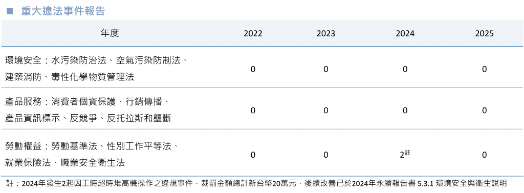 技嘉科技依金融監督管理委員會「永續經濟活動認定參考指引」之重大性定義,針對單一事件罰鍰累積達新台幣100萬元以上,或經主管機關命令停工、歇業、廢止或撤銷相關許可證之裁罰,落實平衡報導及資訊揭露,2025年無發生重大違法事件。針對裁罰金額為非重大裁罰事件,技嘉科技也主動回應並積極改善。