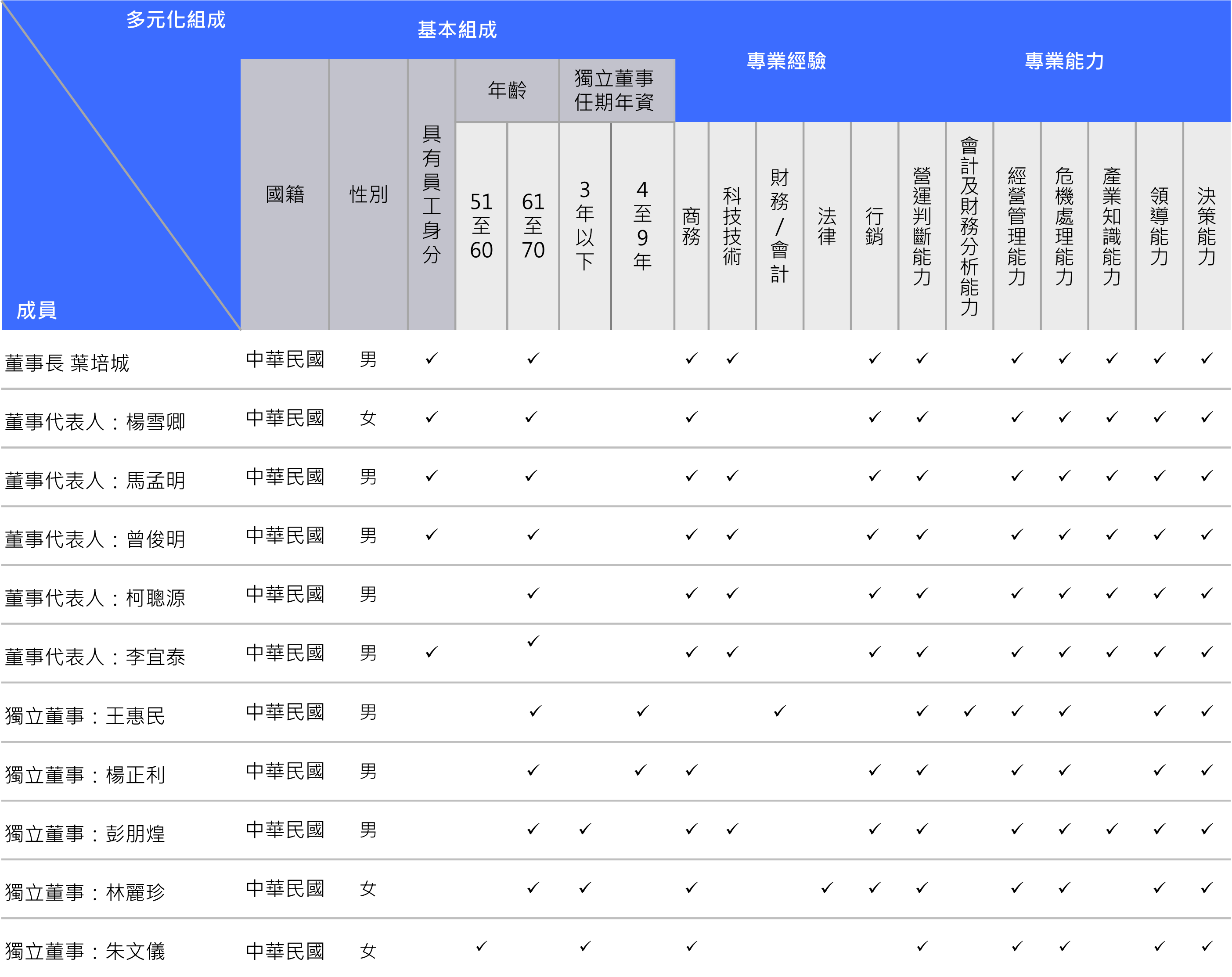 為強化公司治理並促進董事會組成與結構之健全發展,本公司提倡董事會多元化政策以提升公司整體表現。董事會之組成應考量公司營運架構、業務發展方向、未來發展趨勢等各種需求,並宜評估各種多元化面向,例如:基本組成、專業經驗、專業知識與技能。為強化董事會職能達到公司治理理想目標,本公司已訂定「公司治理實務守則」規定董事會整體應具備之能力如下:1.營運判斷能力 2.會計及財務分析能力 3.經營管理能力 4.危機處理能力 5.產業知識能力 6.法律 7.領導能力 8.決策能力。