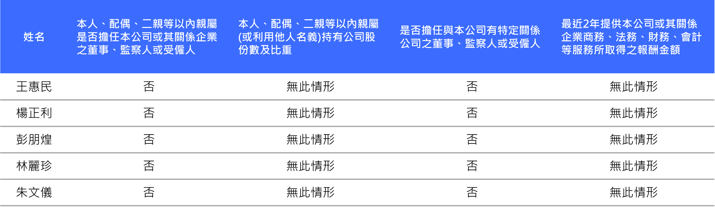 本公司董事會成員11位,包含6位董事及獨立董事5位,獨立董事占全體董事會超過1/3。本公司獨立董事均符合「公開發行公司獨立董事設置及應遵循事項辦法」之規範,且獨立董事皆已依證券交易法第十四條之三賦予充分參與決策及表示意見之權力,據以獨立執行相關職權。各董事及獨立董事間無證券交易法第26條之3規定第3項及第4項規定情事,全體董事均未有公司法第30條所列各款情事。