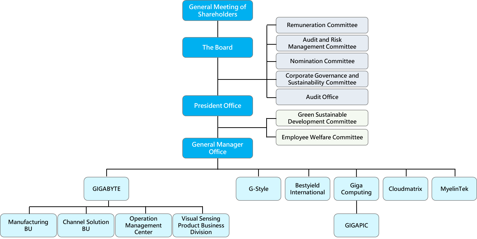 Robust corporate governance is the backbone of business operations. By setting a governance organization and a transparent and prudent decision-making process, GIGABYTE ensures that every step of operational strategy can take full account of all stakeholders. Internal audits and self-inspections are periodically conducted in accordance with corporate governance regulations and principles, and to respect shareholder interests. Clearly defined rules such as “Rules of Procedure for Board of Directors Meetings” and “Procedures for Handling Material Inside Information” serve to ensure operational transparency and prevent conflicts of interest so that the management team can focus on managing the business and fulfillment of social responsibility.