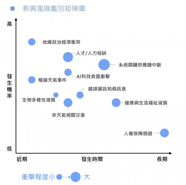 追蹤產業、市場及外在環境變化,並參考《全球風險報告》,掌握新興不確定風險對企業營運的可能衝擊,並擬定管理措施